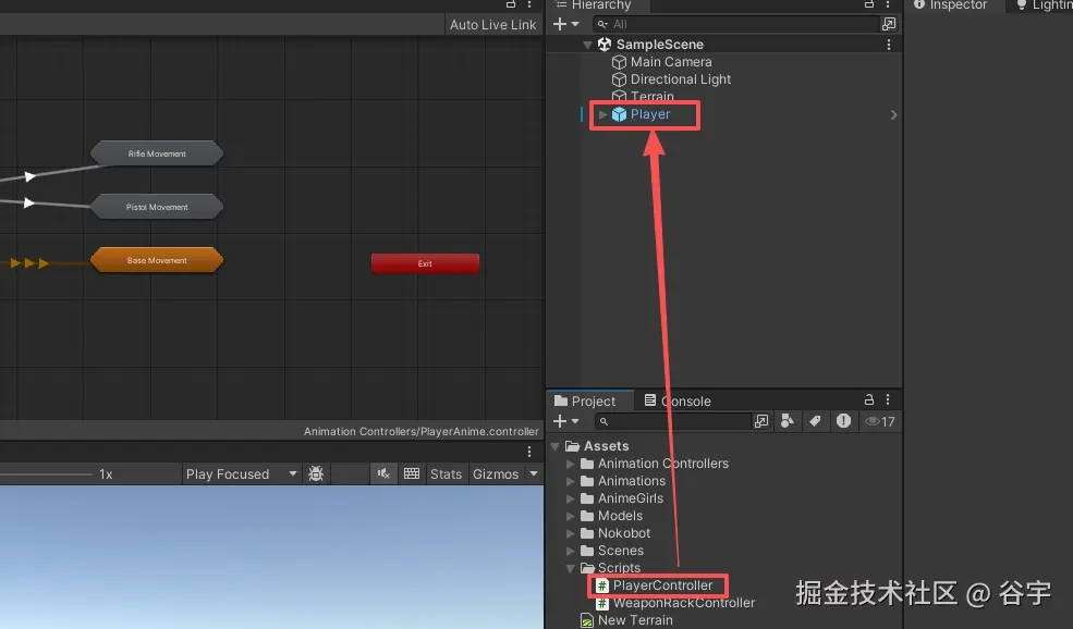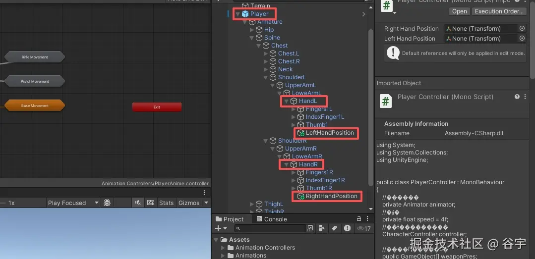 双击打开“PlayerController”脚本,实现角色双手的IK、动画图层操作、武器架操作和动态切换武器。