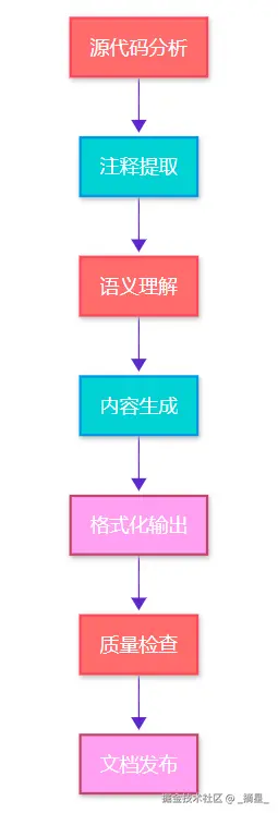 AI技术的引入为文档生成带来了革命性的变化。通过自然语言处理、代码分析和机器学习技术,我们可以实现:图1:AI文档生成流程图 - 展示从源码到文档的完整处理流程