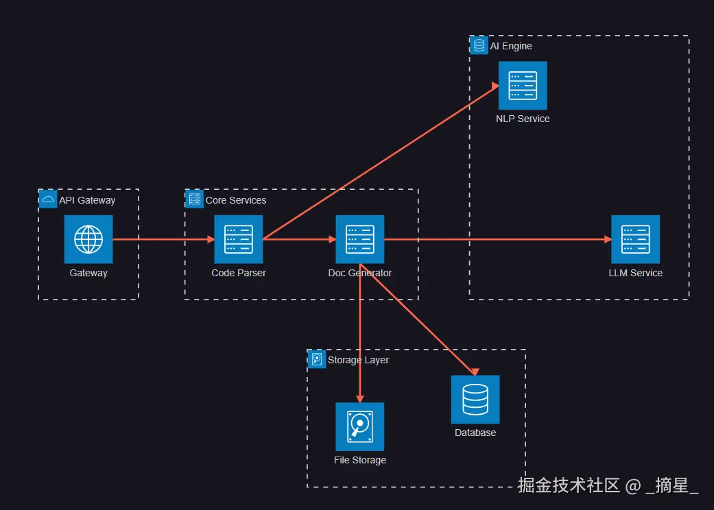 AI文档生成系统采用微服务架构,确保各个组件的独立性和可扩展性:图2:系统架构图 - 展示AI文档生成系统的整体架构设计
