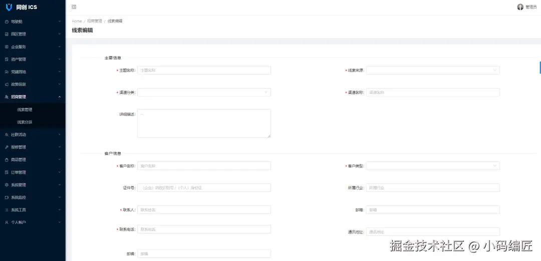 招商中心模块包括线索管理、线索分派、线索跟进和我的线索等功能,跟踪和管理招商信息线索。