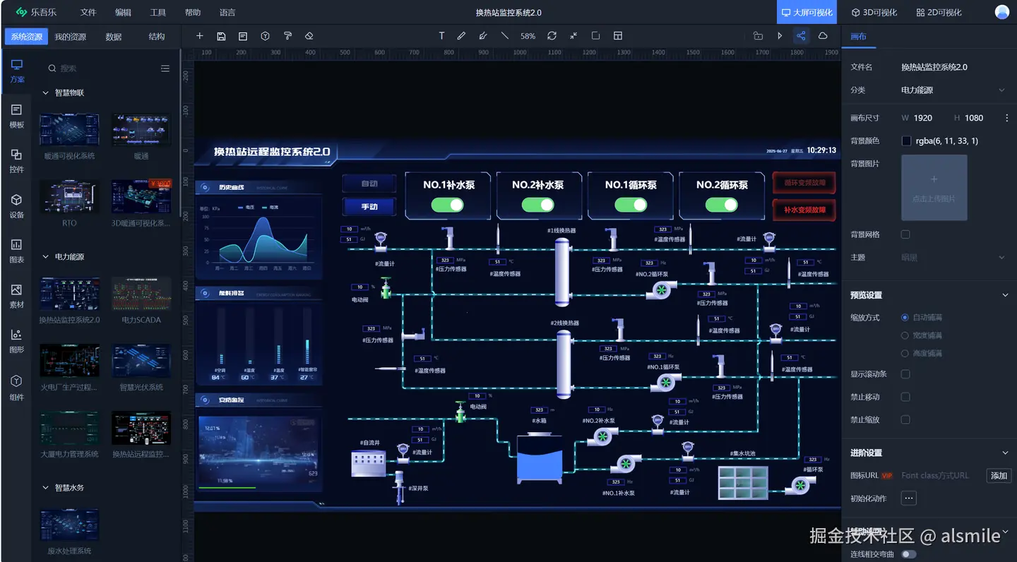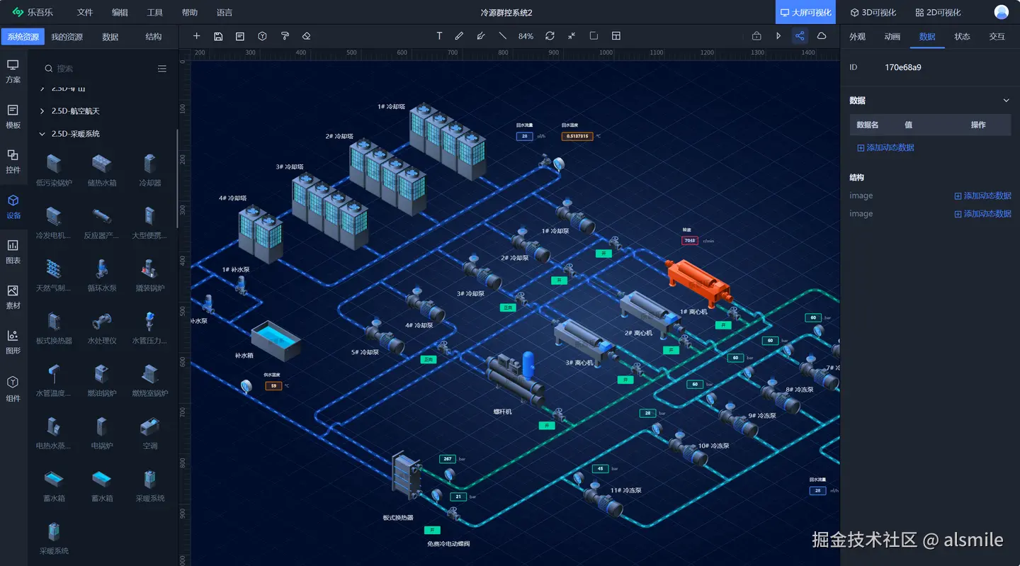 乐吾乐大屏可视化是乐吾乐公司完全自主研发的零代码Web组态可视化+数字大屏 + 工控可视化+监控中心+中控屏画面+数据报表编辑工具,支持以2D/2.5D等形式构建实时数据展示、监控告警、动态交互的组态画面,完全满足国产化需求。为物联网、电力能源、工业互联网等领域的Web组态、智慧数字大屏、工控可视化、触摸屏UI等提供可视化解决方案。丰富的行业模板和组件库、2D与3D的无缝融合,能够快速搭建酷炫、生动、直观、形象的数字大屏和可视化解决方案。配合一键离线部署功能,帮助企业快速交付,降低开发成本,助力数字化转型,携手打造数字化时代的前沿大屏应用。