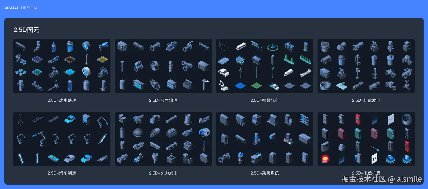 大屏设备:光伏系统、制冷站、废气治理、废水处理、智慧城市、智慧港口、汽车制造、火力发电、电信机房、矿山、采暖系统、锅炉房、风力发电、国家电网、电气工程图元。 大屏素材:标题、装饰、面板