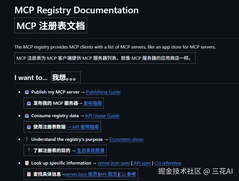Model Context Protocol(MCP)Registry 预览版[5]正式发布,这个项目可以理解为 Node.js 的 npm 或者 Python 的 PyPI 的 MCP 版本。