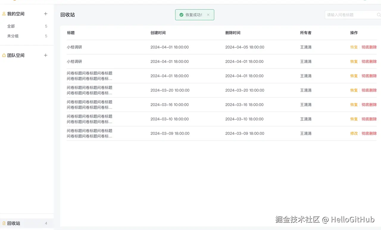 完整的问卷删除与恢复管理能力,防止误操作导致数据丢失。