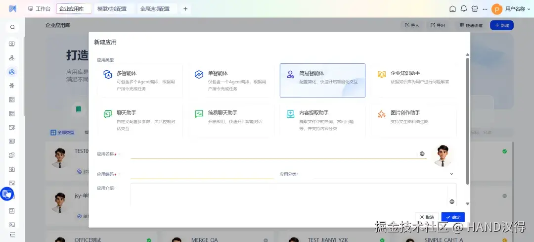 新版本新增了 “简易智能体”与“简易聊天助手” 的应用类型,无需复杂功能,只需简单配置,降低了搭建门槛,业务人员也能快速搭建AI应用,大大提高了配置效率。