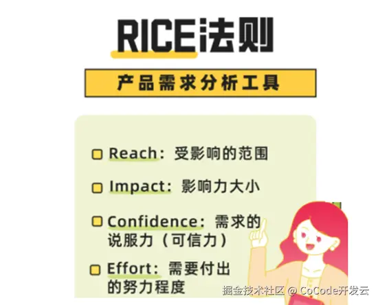 我们可以采用 RICE 模型量化排序,即通过 4 大维度(Reach(覆盖范围)、Impact(影响程度)、Effort(落地成本)给需求打分,总分越高优先级越高: