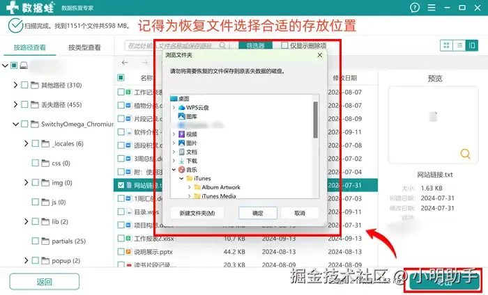 Step.3 选择好需要恢复的文件后按下“导出”按键,之后在“浏览文件夹”弹窗中为恢复导出文件选择合适的存放位置。