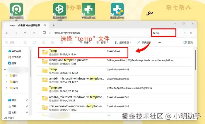 步骤2: 等待电脑完成搜索后,找到位于C盘的临时文件夹,点击打开。
