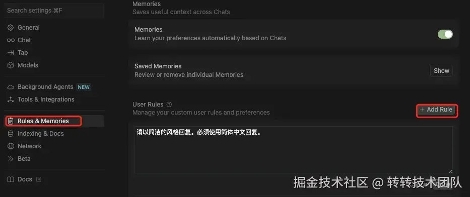 1)User Rules:一劳永逸的全局设置 在 Cursor Settings → Rules & Memories 中设置,比如让AI始终用中文回复,一次设置,所有项目受益。
