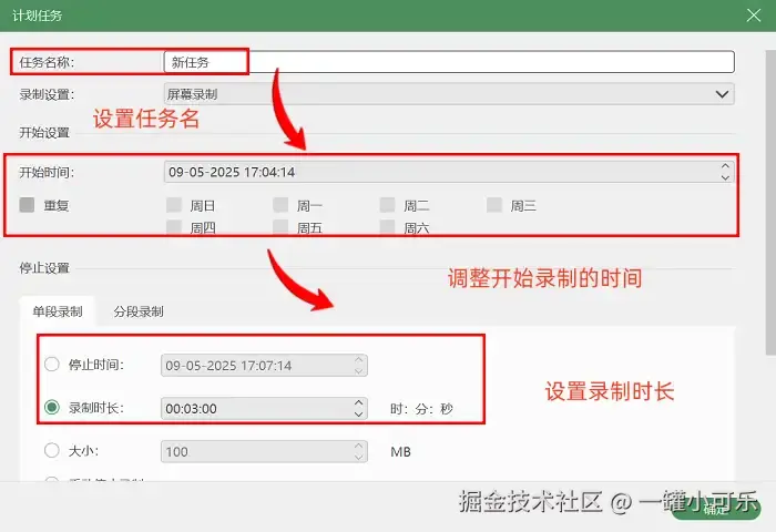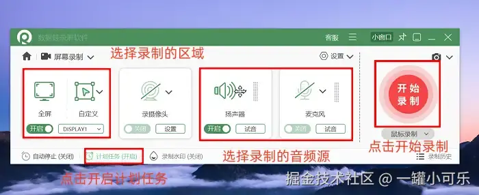 步骤2:确定录制模式后,下一步需完成录制区域的划定与音频来源的选择。如果接下来你还有别的安排,可以提前设置好 “计划录制任务” 。这样软件就会根据你的设置自动开始和结束录制了。