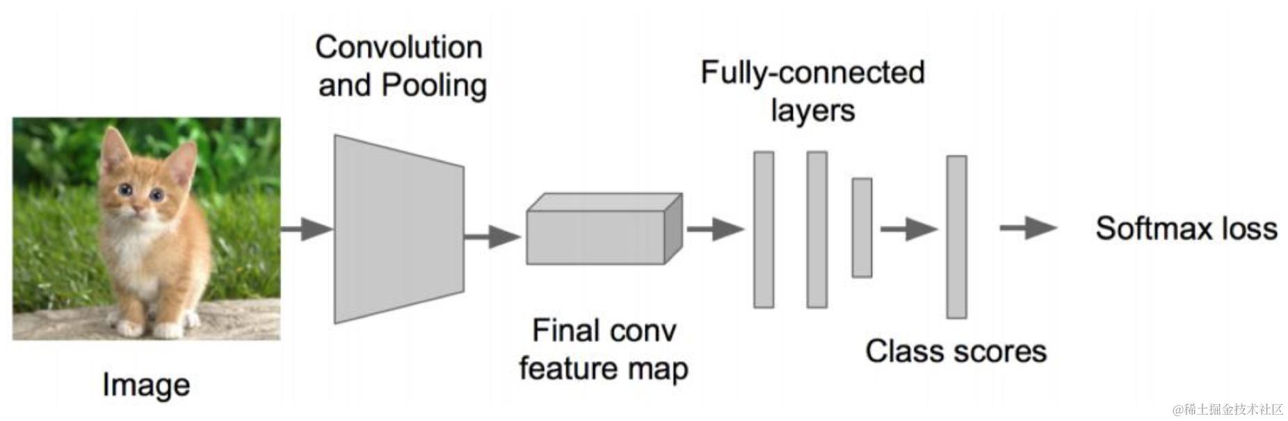 先来回归下分类的原理,这是一个常见的CNN组成图,输入一张图片,经过其中卷积、激活、池化相关层,最后加入全连接层达到分类概率的效果