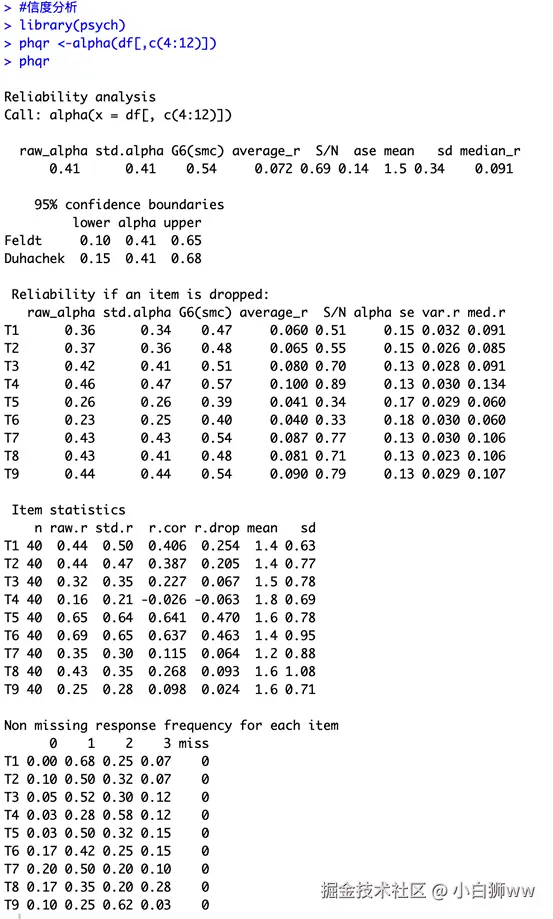 运行以下命令,利用「psych」包中的「alpha」函数进行信度分析。