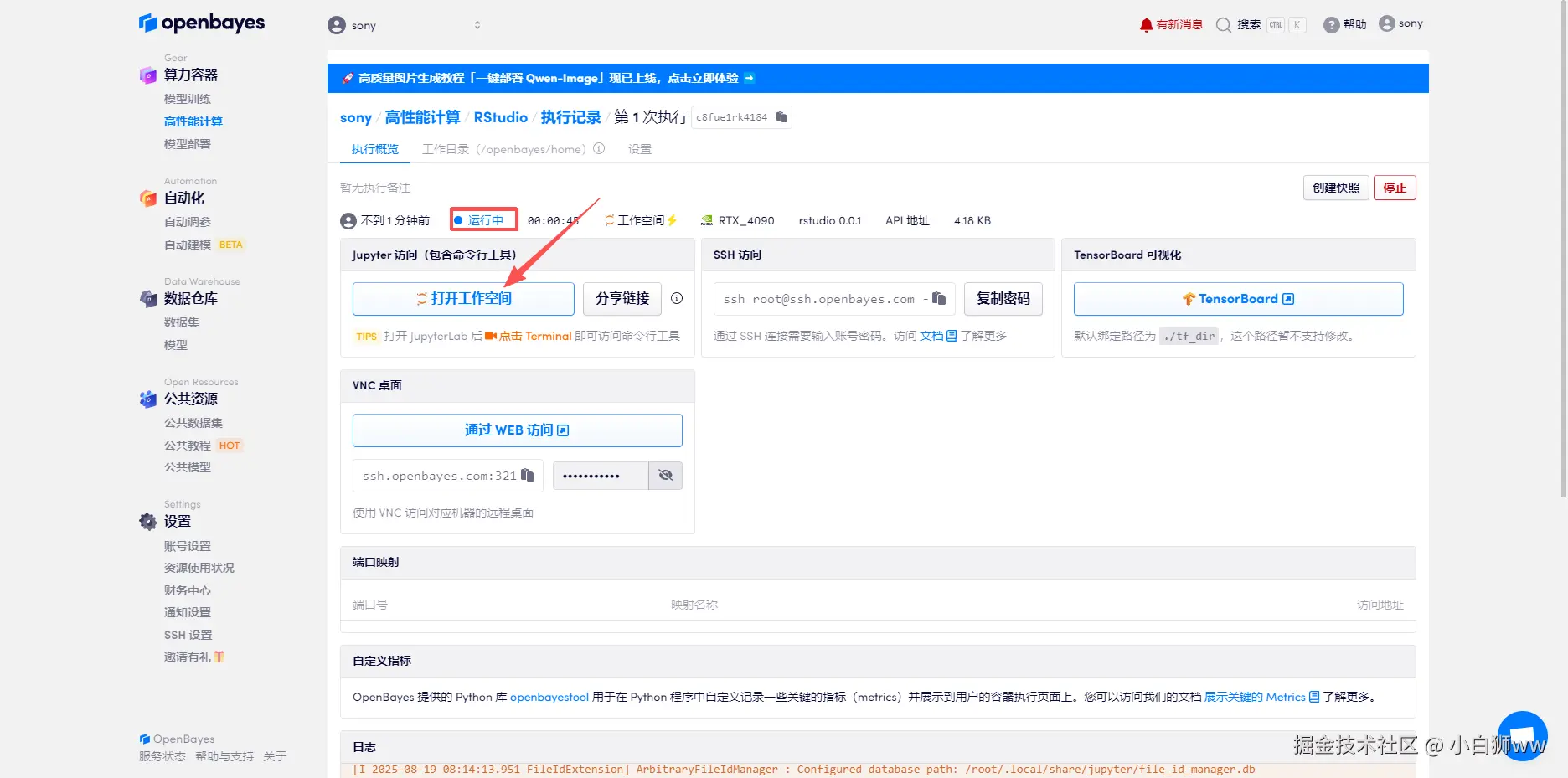 待系统分配好资源,当状态变为「运行中」后,点击「打开工作空间」。