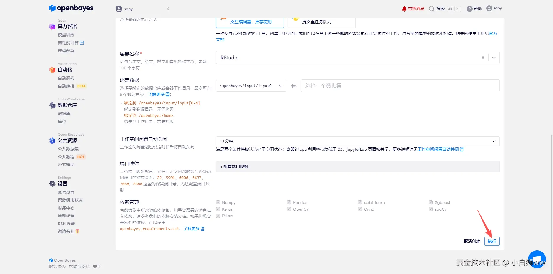 创建容器页面,选择和填写容器信息。然后点击「执行」