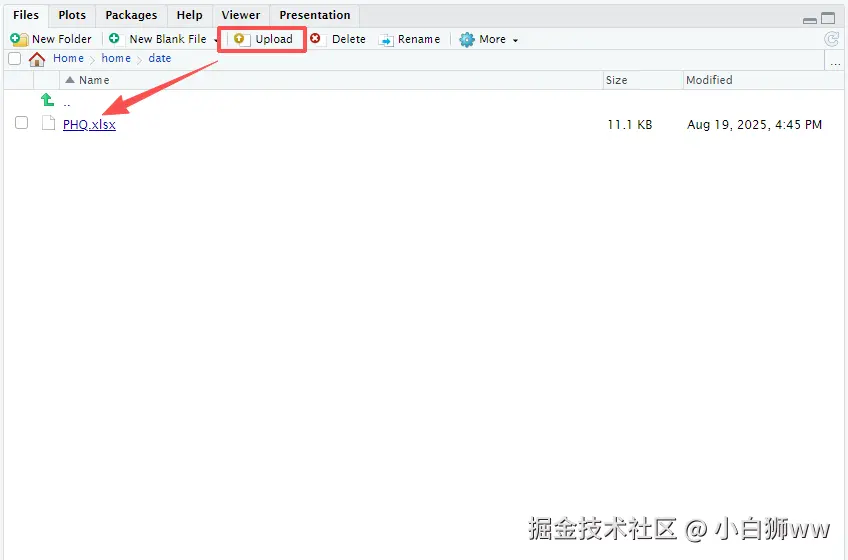 将准备好的 Excel 数据文件,上传至当前工作目录下。本教程使用的数据集为「PHQ 心理学抑郁量表的测评数据」,是模拟心理学上一个比较常用的量表抑郁量表的测评数据。