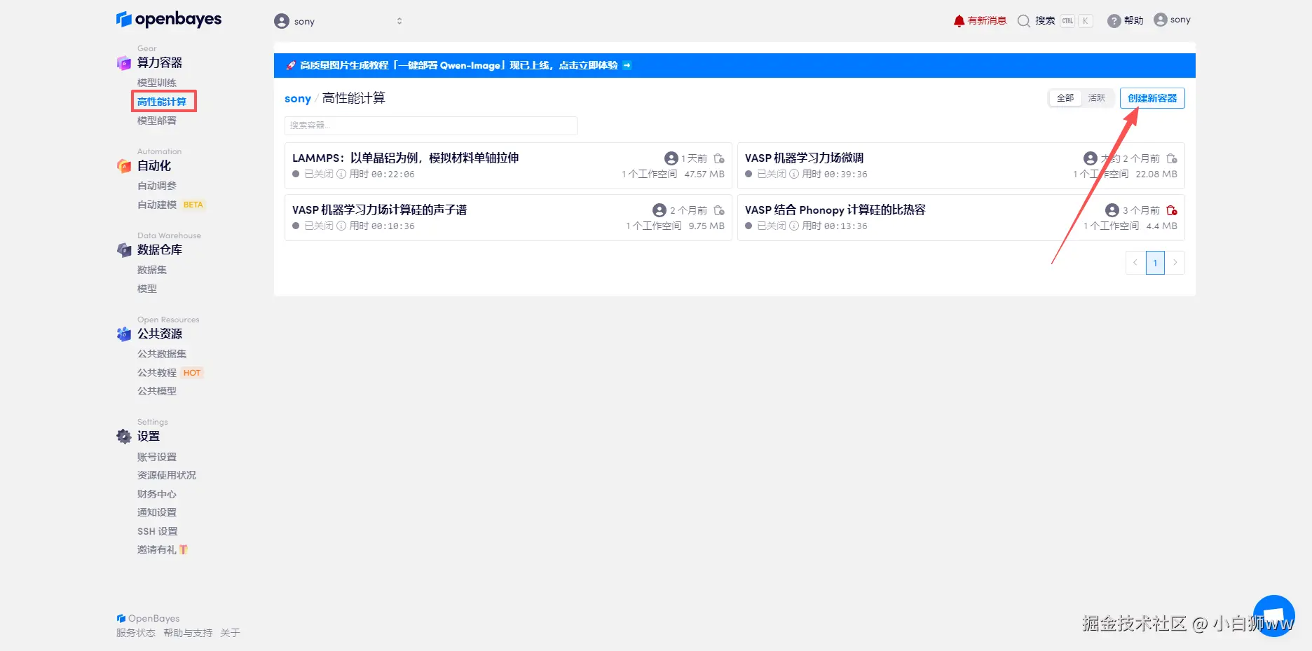 首先进入「高性能计算」页面,点击「创建新容器」。