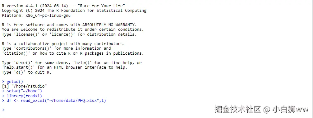 输入以下命令查看当前工作目录,为:/home/rstudio