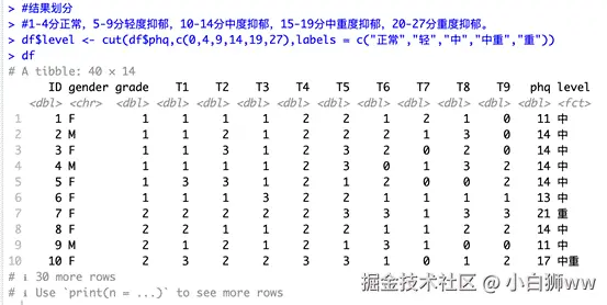 df$level <- cut(df$phq,c(0,4,9,14,19,27),labels = c("正常","轻","中","中重","重"))