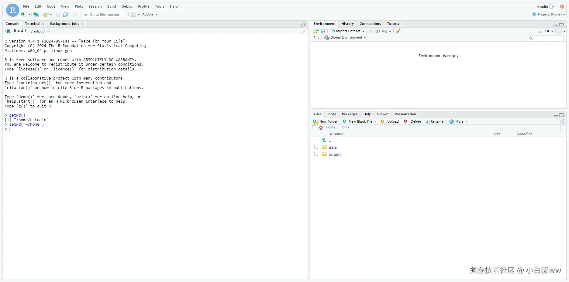 进入到 Rstudio Server 页面后,可以发现跟我们本地安装使用的 Rstudio 是一样的。而唯一不同的是工作目录。