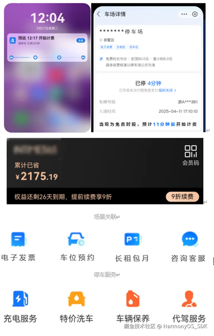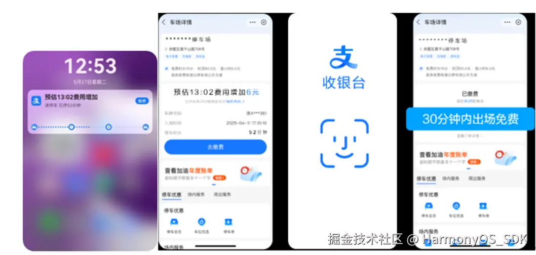 支付宝联合HarmonyOS SDK 实况窗服务(Live View Kit),通过将停车全流程节点可视化:从进场即刻显示计费开始、到跳费前主动提醒、直至离场前智能推荐最优缴费时机,让用户像查看天气一样直观掌握停车状态,真正实现"停车时长一目了然、缴费金额心中有数"的无感体验。