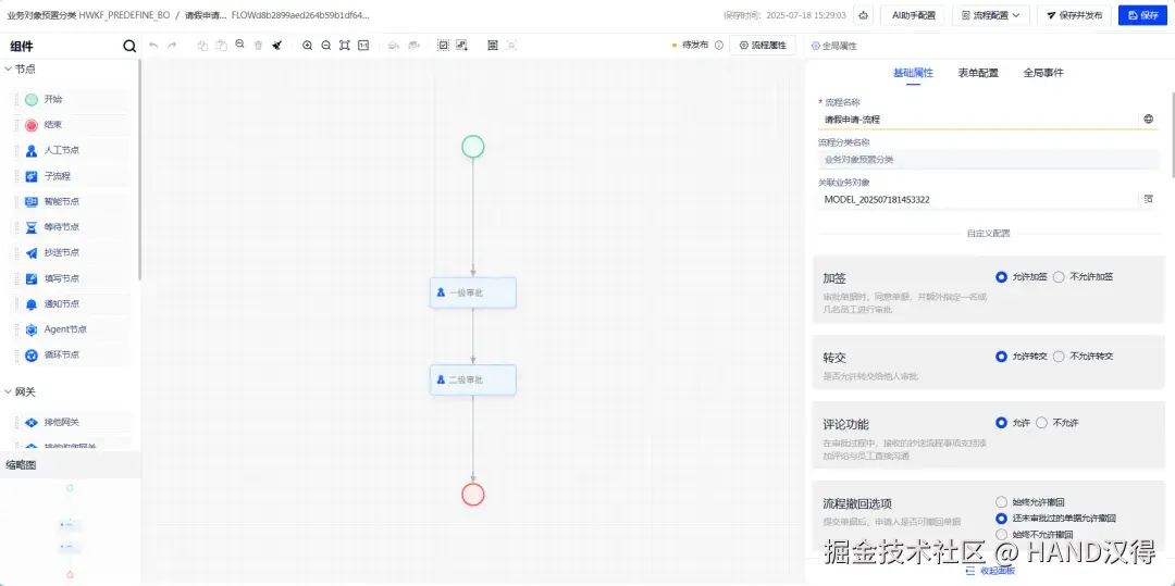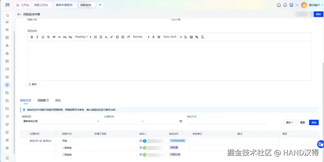 基于业务需求调整默认流程审批流程,通过工作流Tab页查看表单自动新建的流程