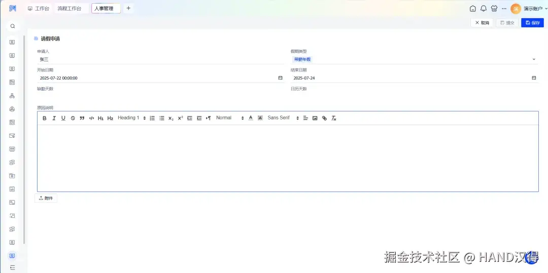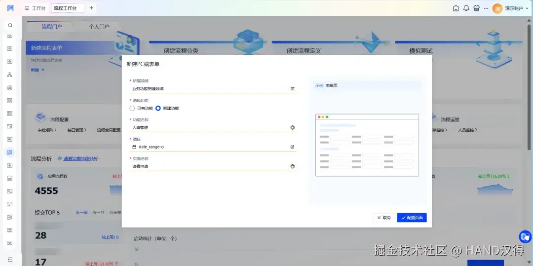 新版流程表单最大的亮点在于能够实现业务页面和流程的自动绑定。当配置人员创建业务表单后, 可直接配置当前表单的审批流程。表单中的信息会自动同步到流程中,触发相应的审批环节和业务操作,实现业务功能的一键激活。