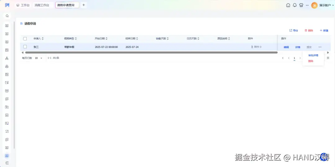 预览自动生成的数据汇总列表效果 系统将根据您创建的流程表单,自动生成对应的数据汇总页面,您可以在【列表设计】中对自行修改展示内容