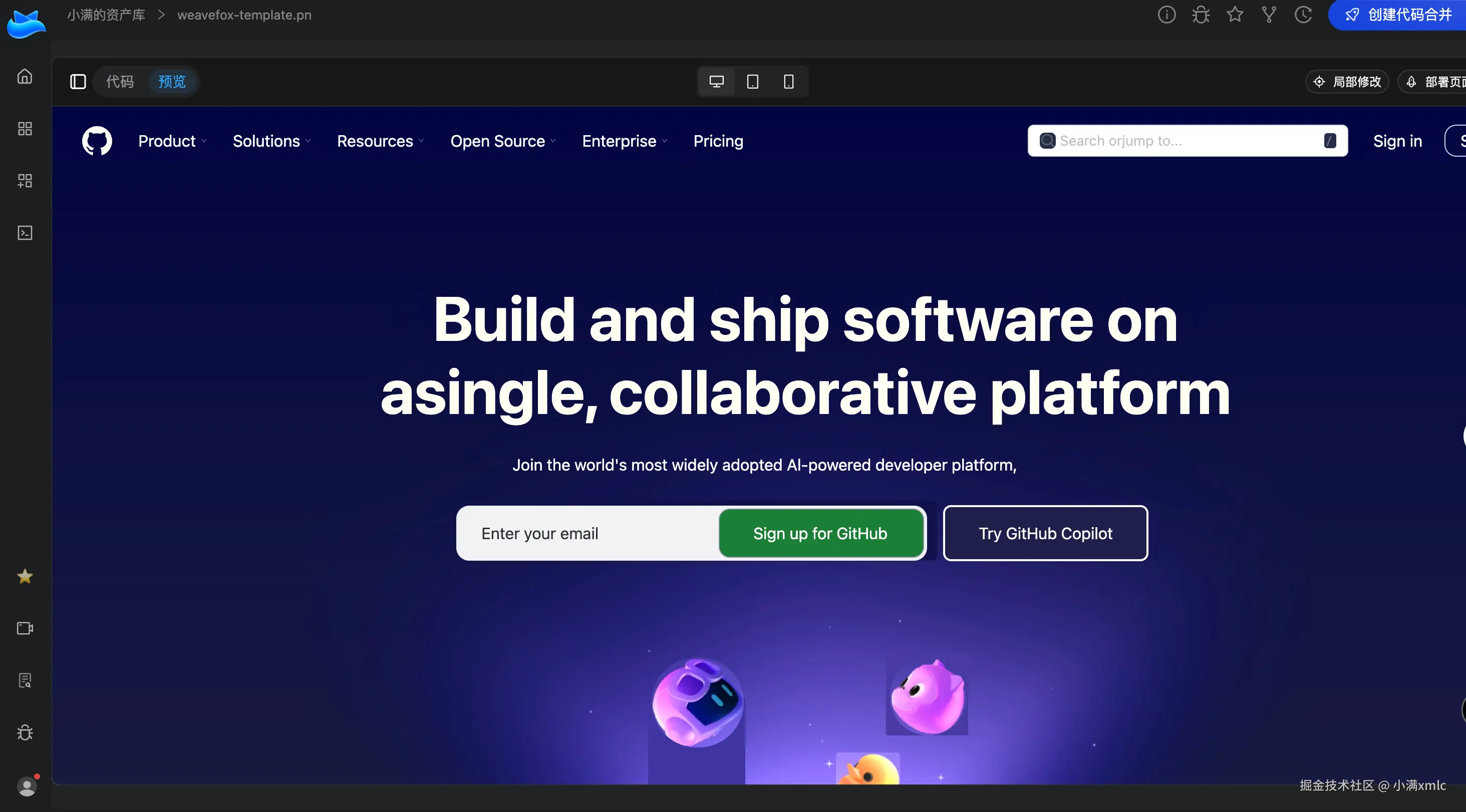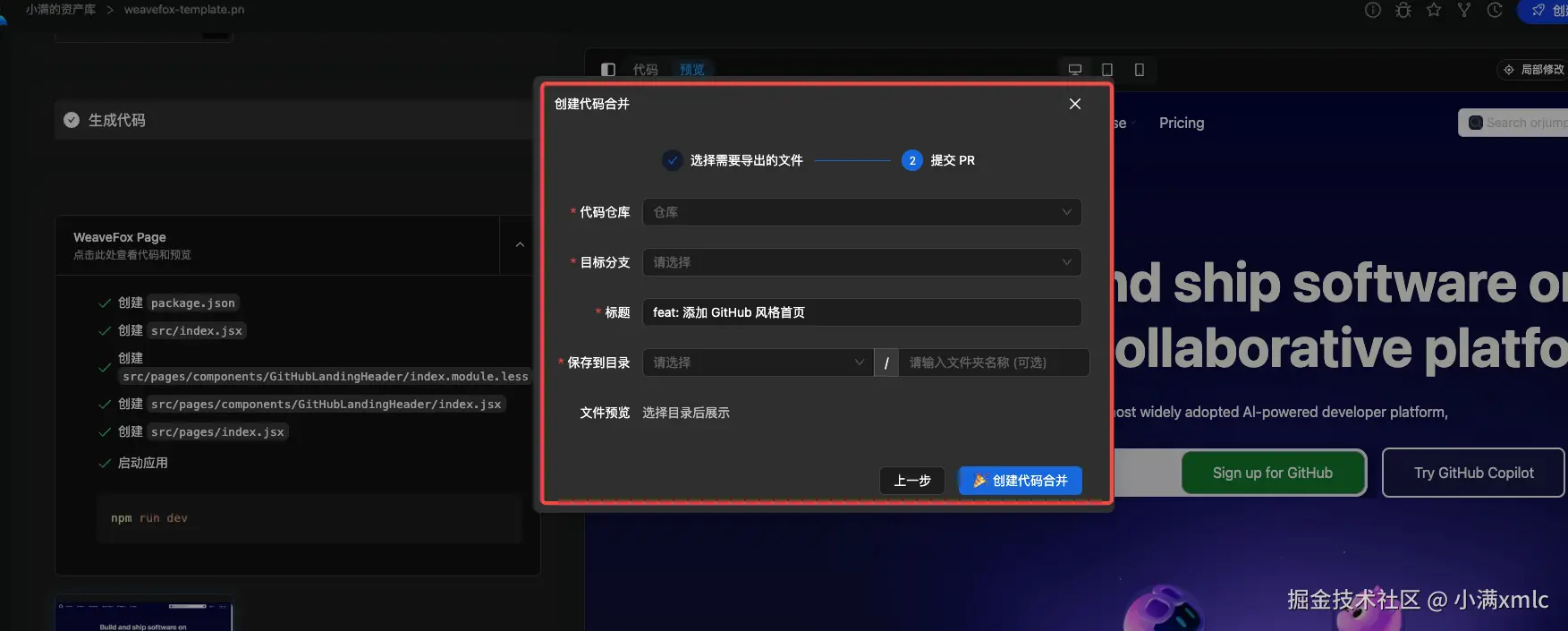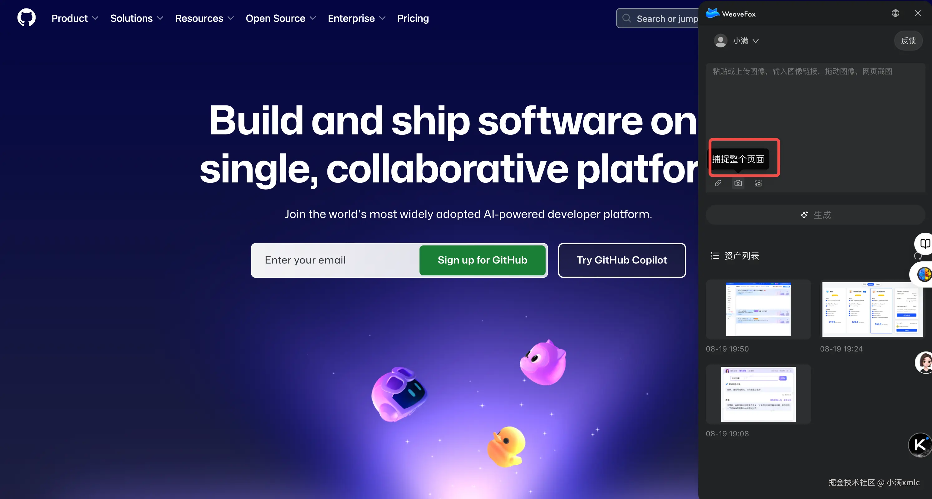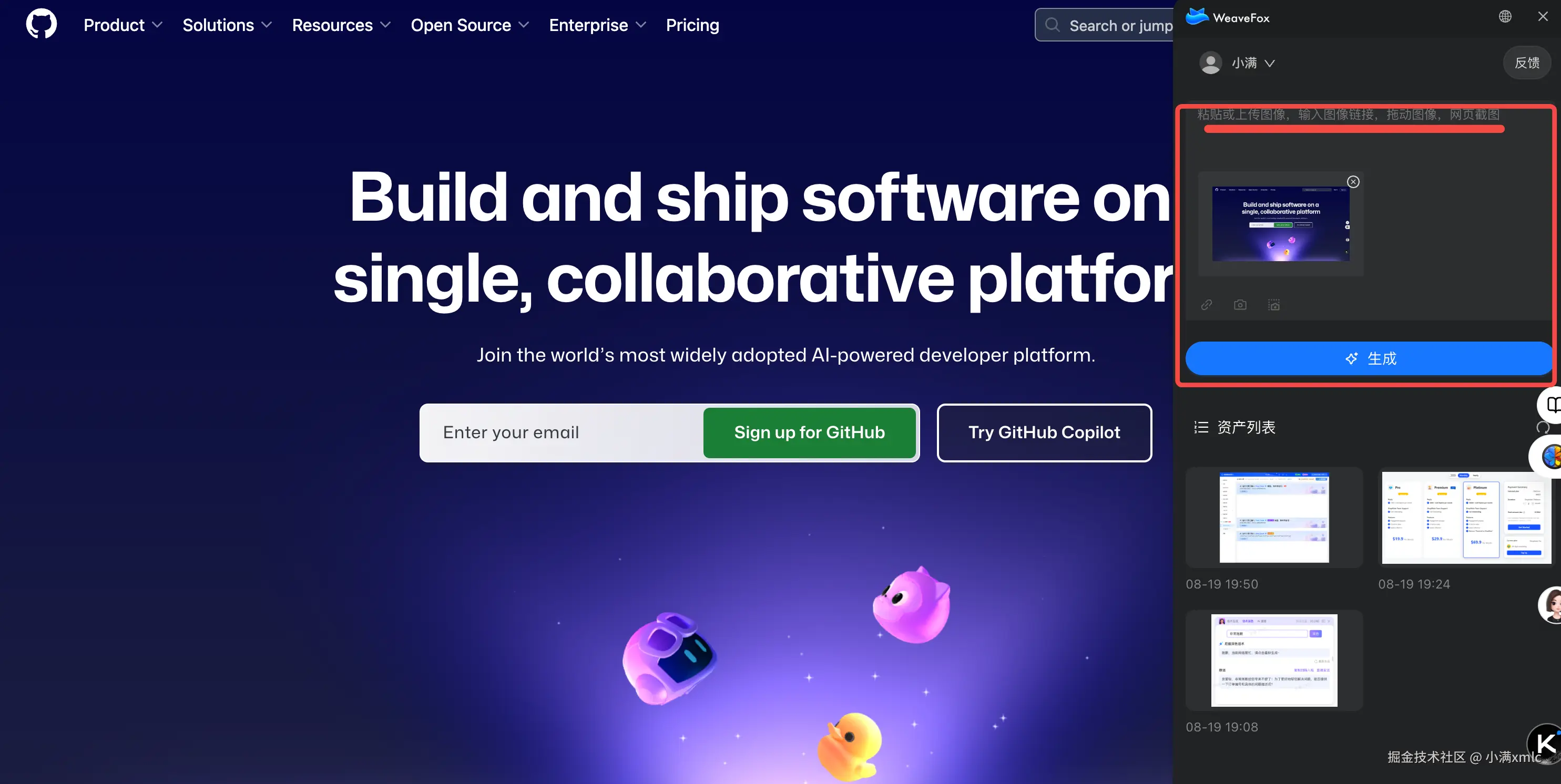 添加后, 你可以在浏览器中的任何地方唤起 weavefox, 我们以 github 官网作为例子生成内容