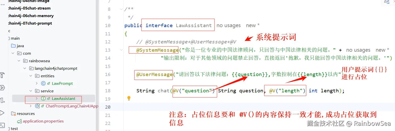 利用提示词模板(@UserMessage设计,@V)精确控制输入和期望的输出格式,确保问题被正确理解和回答