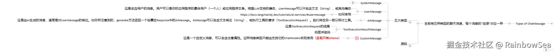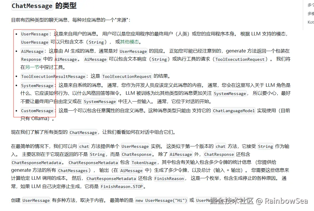 UserMessage:这是来自用户的消息。 用户可以是您应用程序的最终用户(人类)或您的应用程序本身。 根据 LLM 支持的模态,UserMessage可以只包含文本(String), 或其他模态。AiMessage:这是由 AI 生成的消息,通常是对UserMessage的回应。 正如您可能已经注意到的,generate 方法返回一个包装在Response中的AiMessage。AiMessage可以包含文本响应(String)或执行工具的请求(ToolExecutionRequest)。 我们将在另一节中探讨工具。ToolExecutionResultMessage:这是ToolExecutionRequest的结果。SystemMessage:这是来自系统的消息。 通常,您作为开发人员应该定义此消息的内容。 通常,您会在这里写入关于 LLM 角色是什么、它应该如何行为、以什么风格回答等指令。 LLM 被训练为比其他类型的消息更加关注SystemMessage, 所以要小心,最好不要让最终用户自由定义或在SystemMessage中注入一些输入。 通常,它位于对话的开始。CustomMessage:这是一个可以包含任意属性的自定义消息。这种消息类型只能由 支持它的ChatLanguageModel实现使用(目前只有 Ollama)。