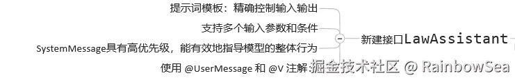 用SystemMessage明确定义助手的角色和能力范围,将其限定在法律咨询领域。在LangChain4j中,我们主要利用SystemMessage来实现这一点,SystemMessage具有高优先级,能有效地指导模型的整体行为