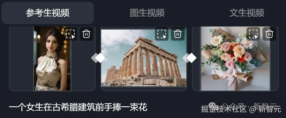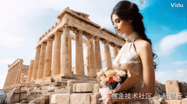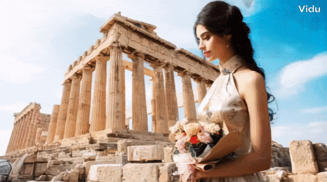 比如上传一个女孩、帕台农神庙、一束花,Vidu 丝滑地将其呈现在一个场景中。