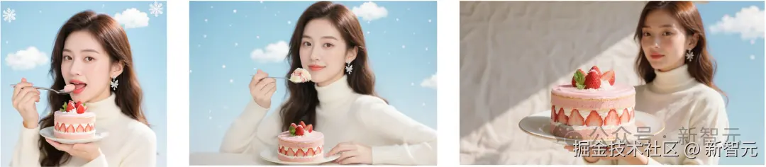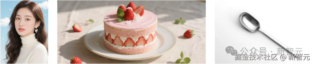 而 Flux.1 Kontext 在衣服、人脸一致性上表现欠佳,且蛋糕比例失调,没有体现勺子这个元素。