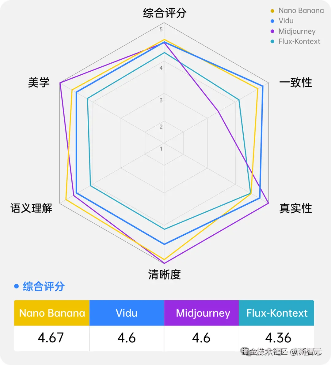 在一致性、美学、真实性、清晰度、语义理解综合评分上,Vidu Q1 参考生图完全碾压 Flux Kontext,与 Nano Banana 相媲美。