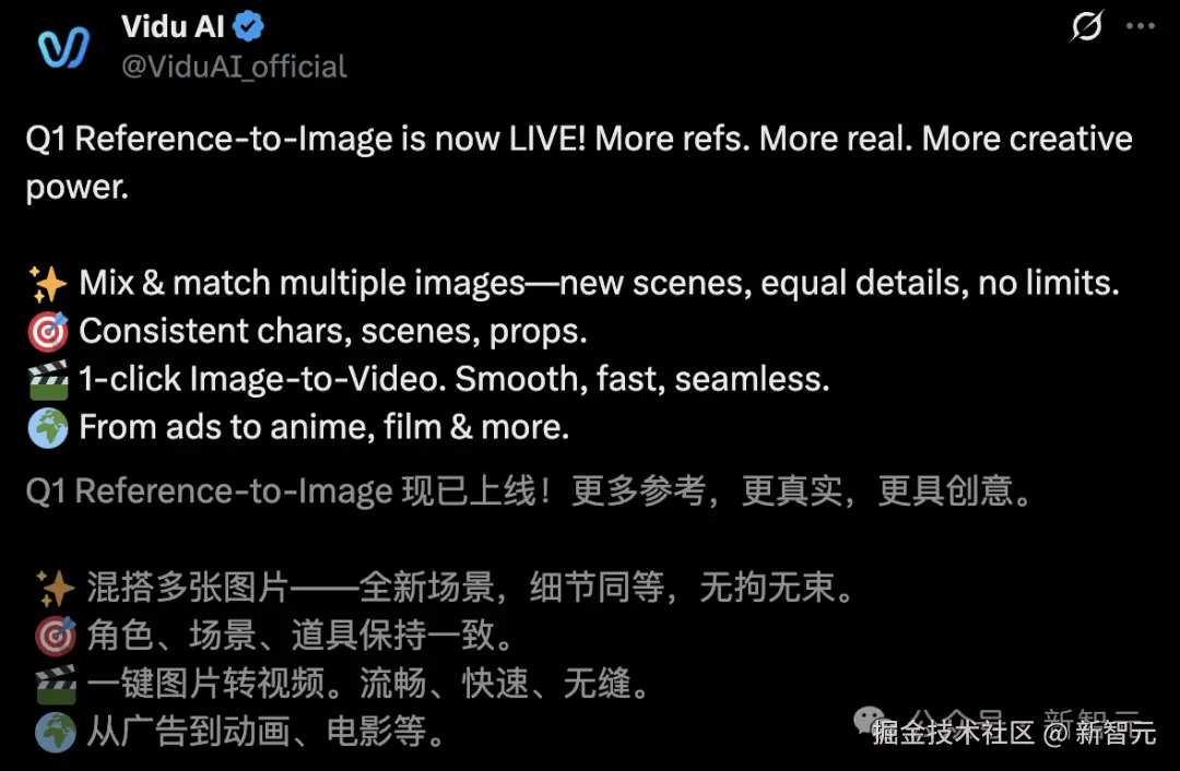 「【新智元导读】谷歌「香蕉」P 图爆火全网,发布不过 10 天,终极平替就来了。今天,Vidu Q1 全球上线「参考生图」功能,一次 7 张图,人物、背景、道具随意组合,逼真还原还能脑洞大开,效果完胜 Flux Kontext,直逼 Nano Banana。」