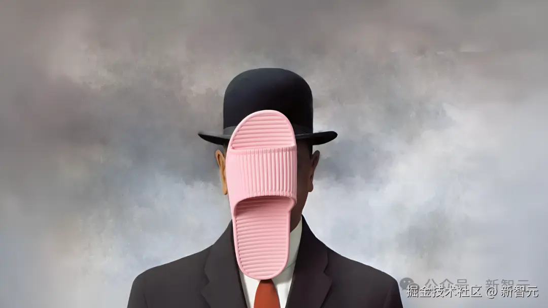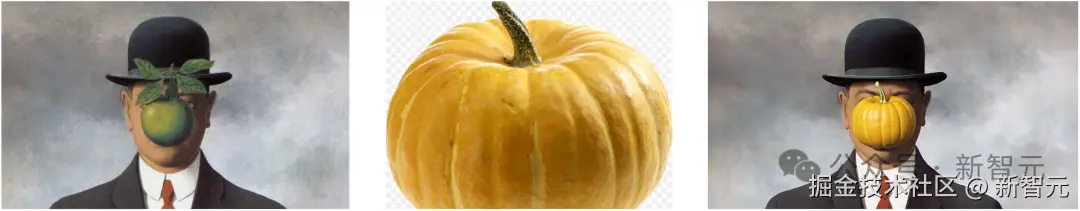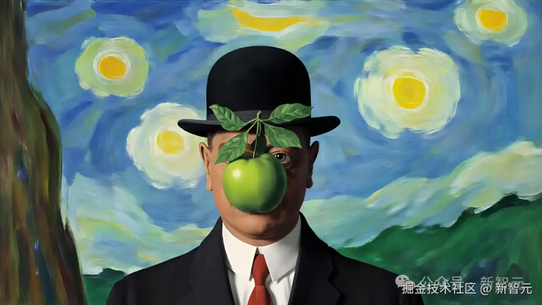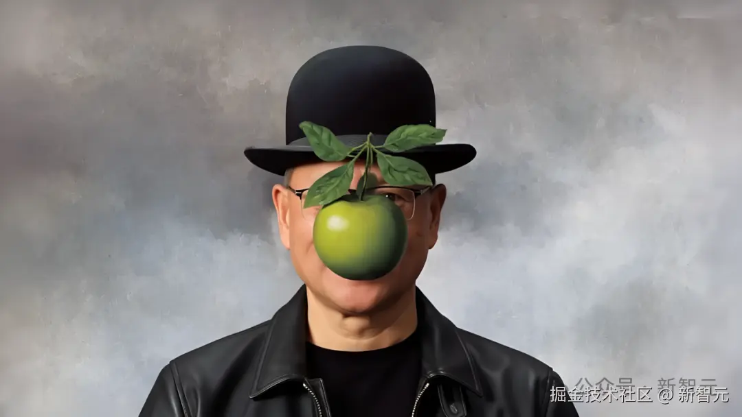 再以马格利特一幅世界名画《人类之子》为模板,玩一场「绿色苹果」大替换。
