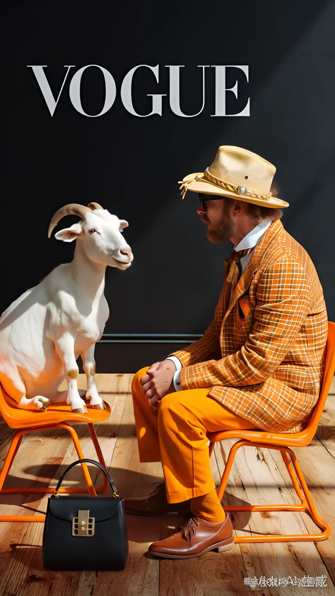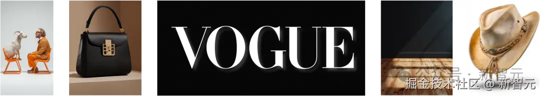 [@图 2]背景改为 [@图 5],[@图 5] 背景标注 [@图 1]VOGUE logo,[@图 2] 人物脚下摆着一款 [@图 3] 包,[@图 2]人物戴着 [@图 4] 帽子,[@图 2]背景不变,构图不变,主体不变