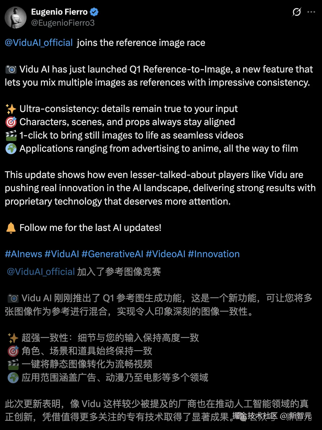 还有人盛赞 Vidu Q1 参考生图一致性,并称,Vidu 这种低调的实力派,真正推动了 AI 领域的创新。
