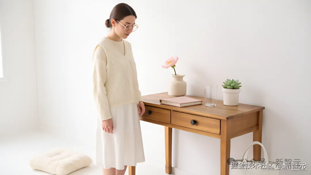prompt:[@图 1] 一个明亮的北欧风房间,木质书桌上放着粉色笔记本和玻璃杯,旁边花瓶里有一枝粉色花朵,桌角有小多肉植物。地上有毛绒坐垫和白色帆布包。一位戴玫瑰金圆框眼镜、穿米白色针织背心和白裙的温柔女生站在房间里,安静地看着书桌,整体氛围清新治愈。