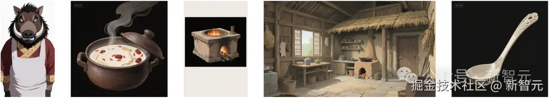 prompt:侧面视角,[@图 1]站在 [@图 3] 灶台边 [@图 2] 锅前手中拿着大勺 [@图 5] 搅拌,锅里装着[@图 2],背景[@图 3][@图 4],动漫风格,2D,动画风格,