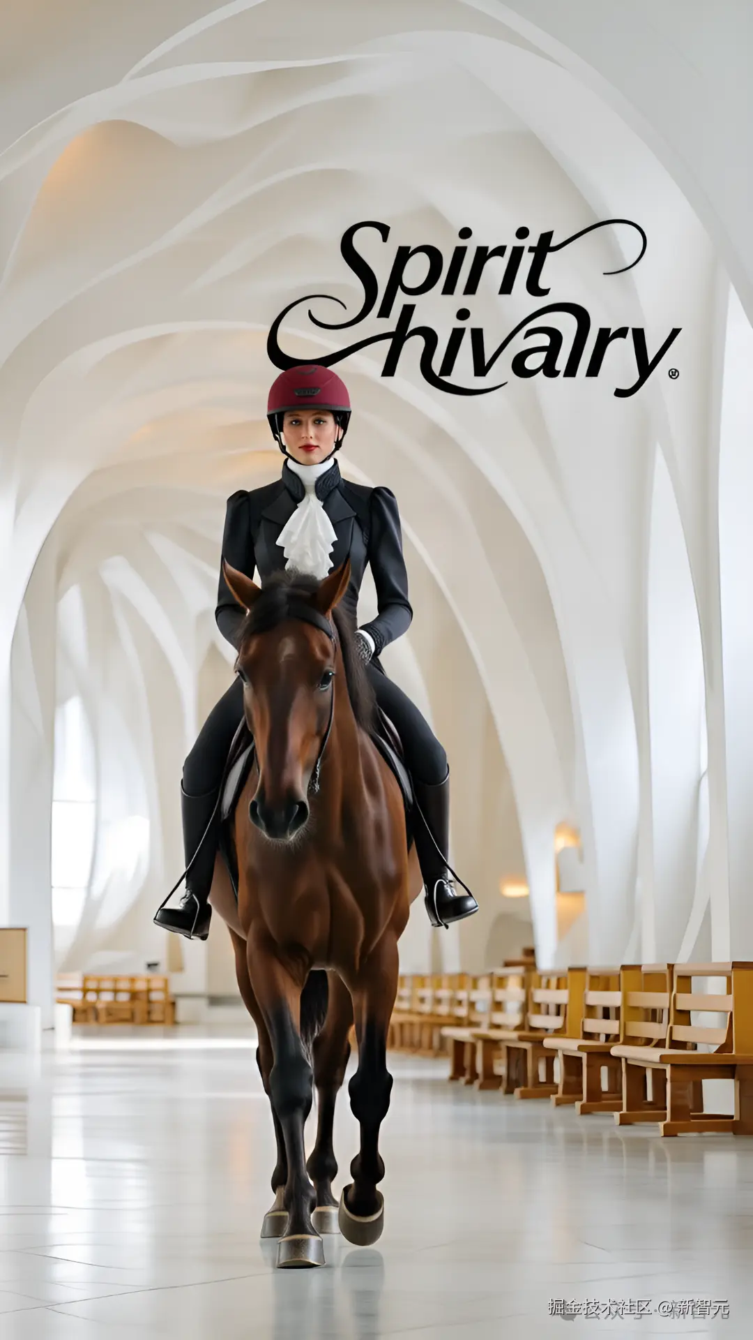 prompt:[@图 1]穿着 [@图 2] 服装,[@图 1]头戴 [@图 3] 帽子,骑着 [@图 5] 马,背景是[@图 4],右上角印有[@图 6]logo