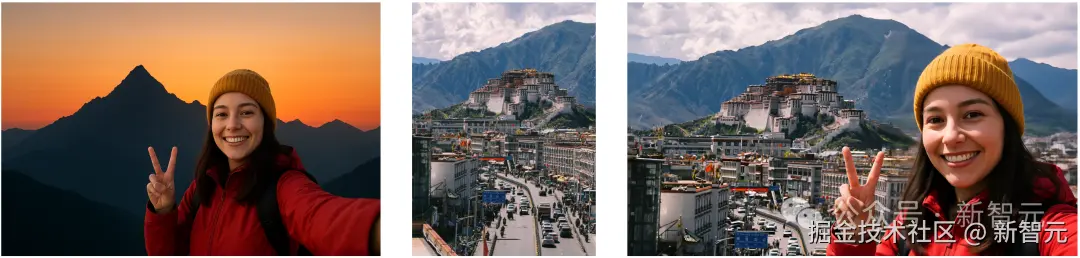 从相册中,上传一张自拍照,以及一张布达拉宫图,P 图瞬间完成,人物和背景超自然融合,可以发圈了。