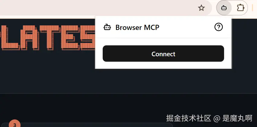 点击浏览器工具栏里的 Browser MCP 扩展图标,在需要控制的标签页里点 Connect(操作都会发生在被连接的那个标签页)。
