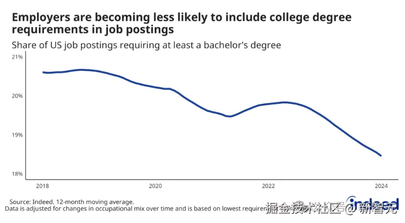 Indeed 数据表明,2024 年初,美国有 52% 的职位不再提及任何正式教育要求,而要求本科学历的职位比例也从五年前的 20.4% 下降到了 17.8%