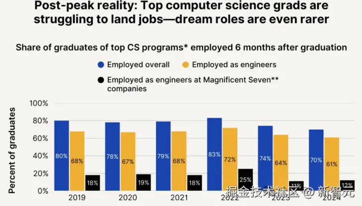 调查表明,从 MIT、斯坦福、卡内基梅隆、伯克利等精英院校的毕业生,进入大厂的比例从 25% 骤降至 11%-12%。