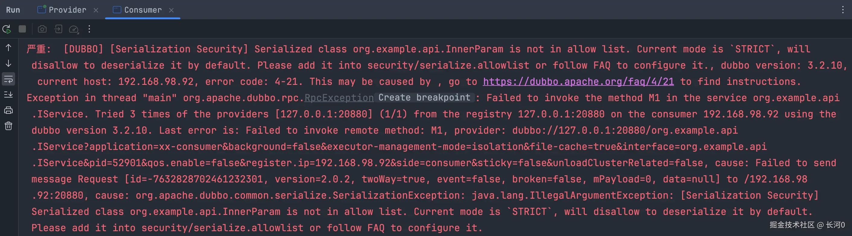 因为消费者模块和公共 API 模块依赖的三方库版本不同,导致消费者模块缺少一部分类,进而导致消费者在注册 Service Class 方法参数到序列化白名单时,发生异常中断跳出,没有被信任的参数类,一旦序列化就会抛出异常。