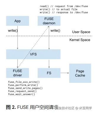 应用发起写入/storage/emualated/userid → 内核拦截(dev/fuse 挂载点)→ FUSE Daemon 接收请求 → 调用MediaProvider校验权限 → 校验成功 → 写入data/media/userid 。