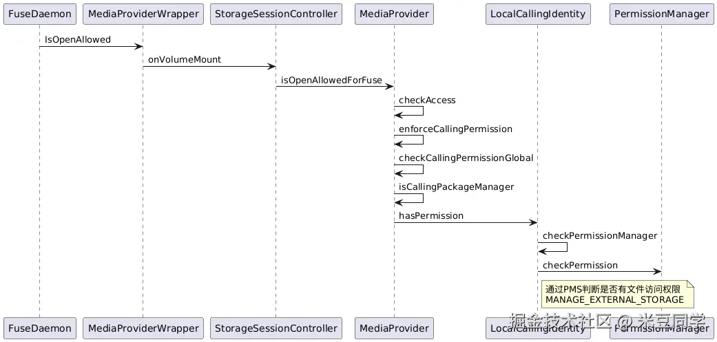 Fuse deamon 收到fuse 驱动发来的文件操作请求后,会调用MediaProviderWrapper::IsOpenAllowed()判断是否有权限,MediaProvider 权限校验流程如下: