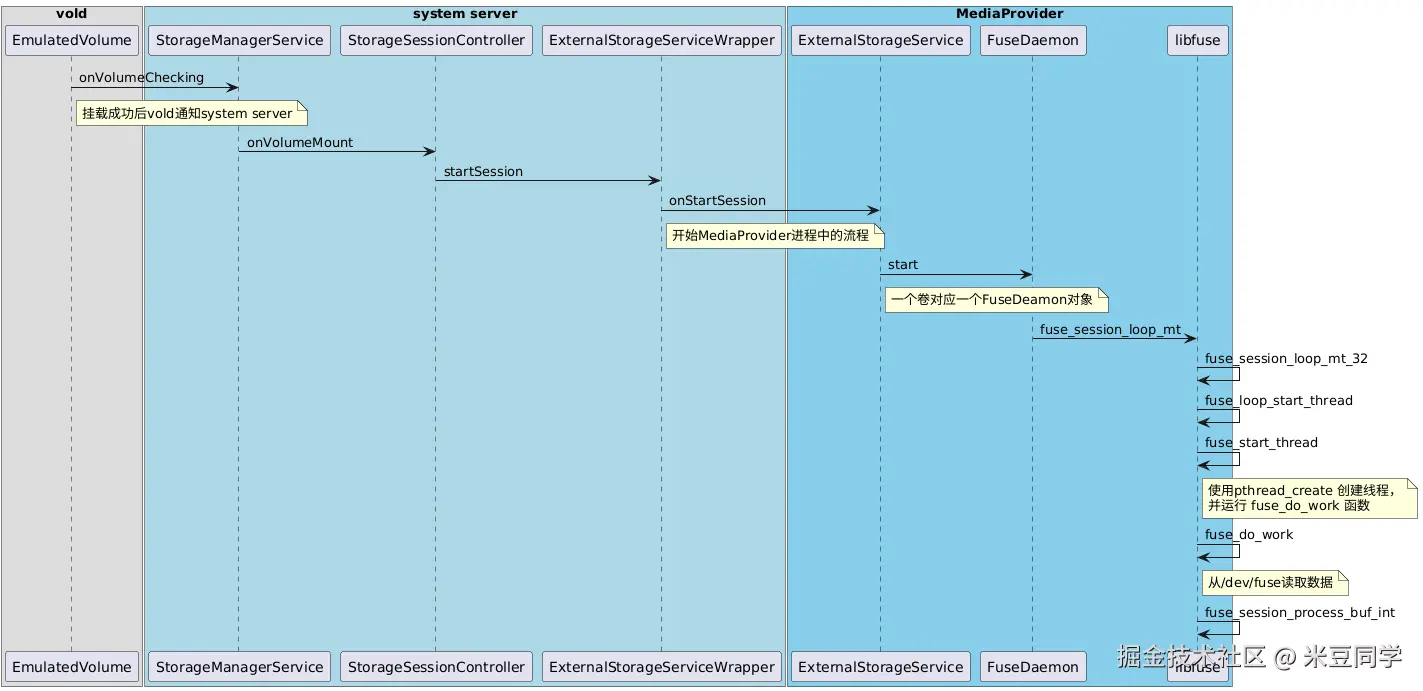 - fuse挂载后回调StorageManagerService.onVolumeChecking通知上层,如果上层不抛异常,则挂载完成