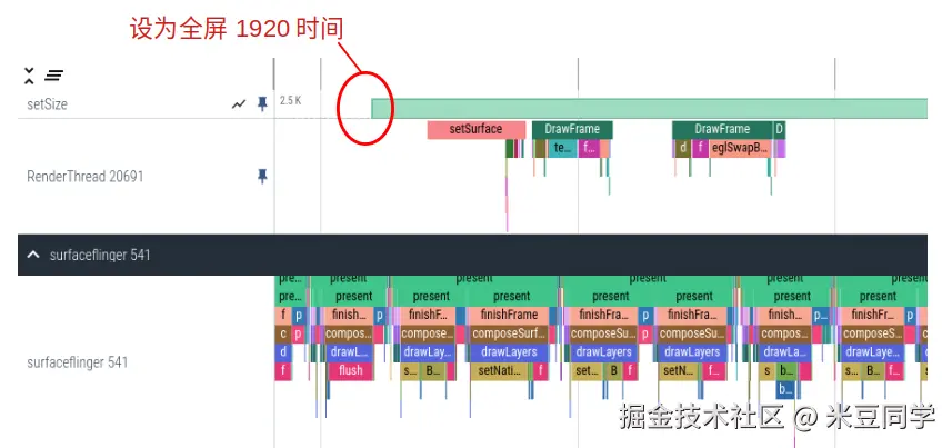 已经设置给layer了,那么就怀疑应用没有用新的尺寸绘制,我们先看trace 中setLayer 之后的应用端绘制: